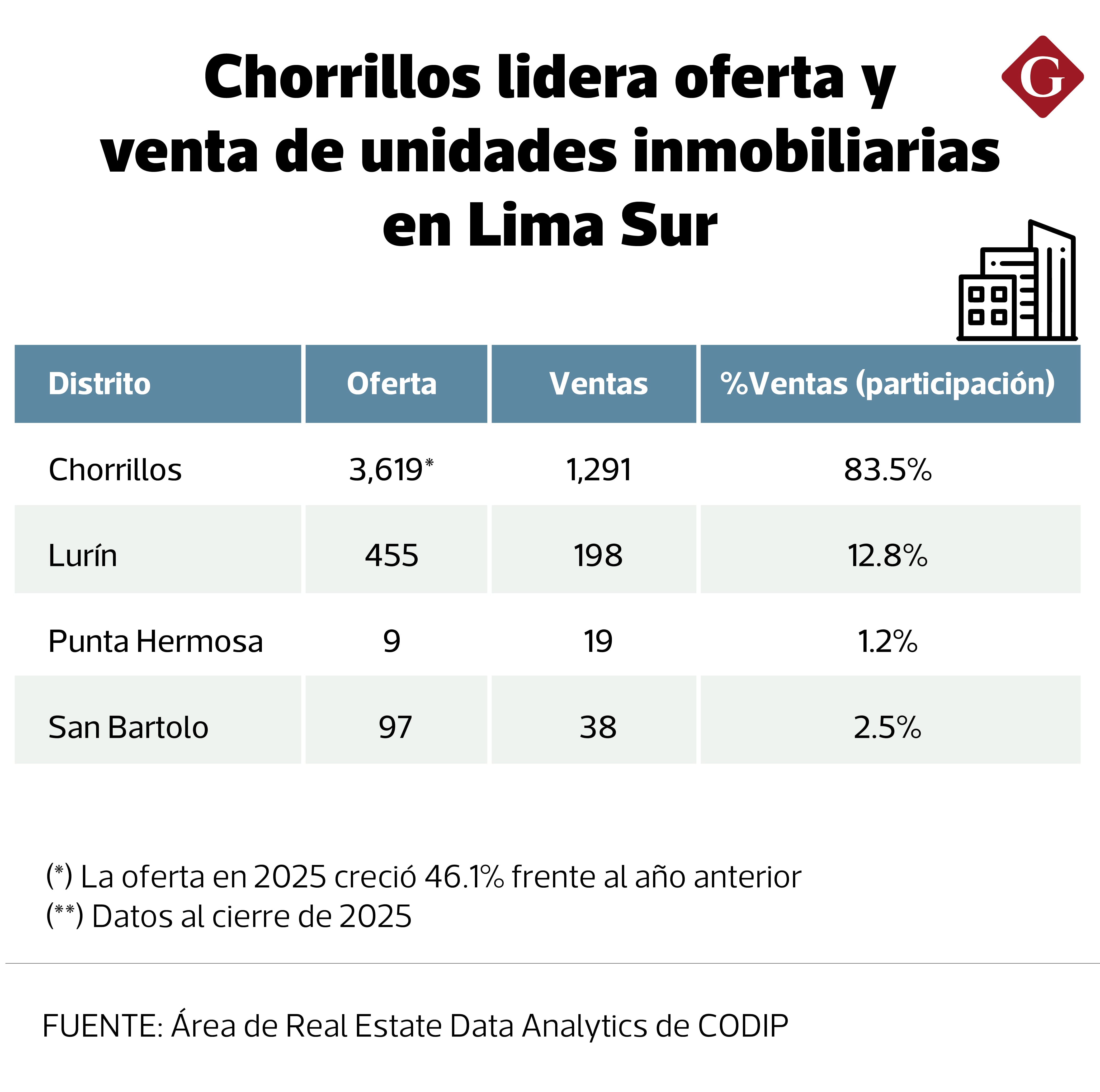 De acuerdo con la Confederación de Desarrolladores Inmobiliarios del Perú (CODIP), Lima Sur se consolidó en 2025 como la zona de mayor dinamismo en el mercado inmobiliario, al registrar un crecimiento de 61.9% en la venta de unidades frente al año anterior. Este impulso tuvo un protagonista claro: Chorrillos, conocida como la “Ciudad Heroica”, que lideró la expansión al concentrar el 83.5% del total de unidades vendidas en la zona.