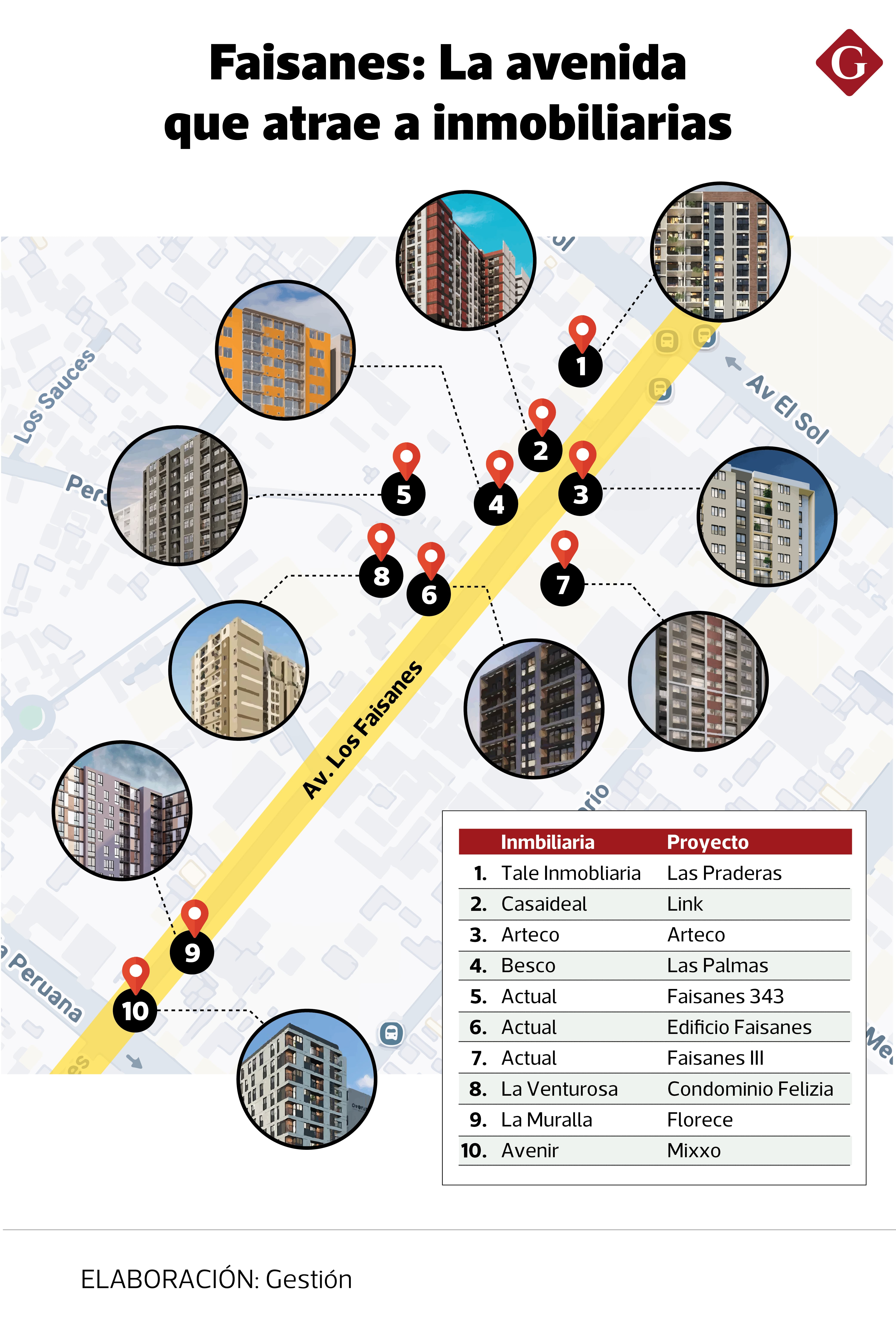 En esa avenida, que se extiende desde el cruce con la av. El Sol hasta la av. Guardia Peruana, operan al menos 10 inmobiliarias. Entre ellas, Actual destaca por ser la única con más de un proyecto en la zona —tres en total—, los cuales se ubican muy próximos entre sí: prácticamente uno al lado del otro y uno frente a los demás.